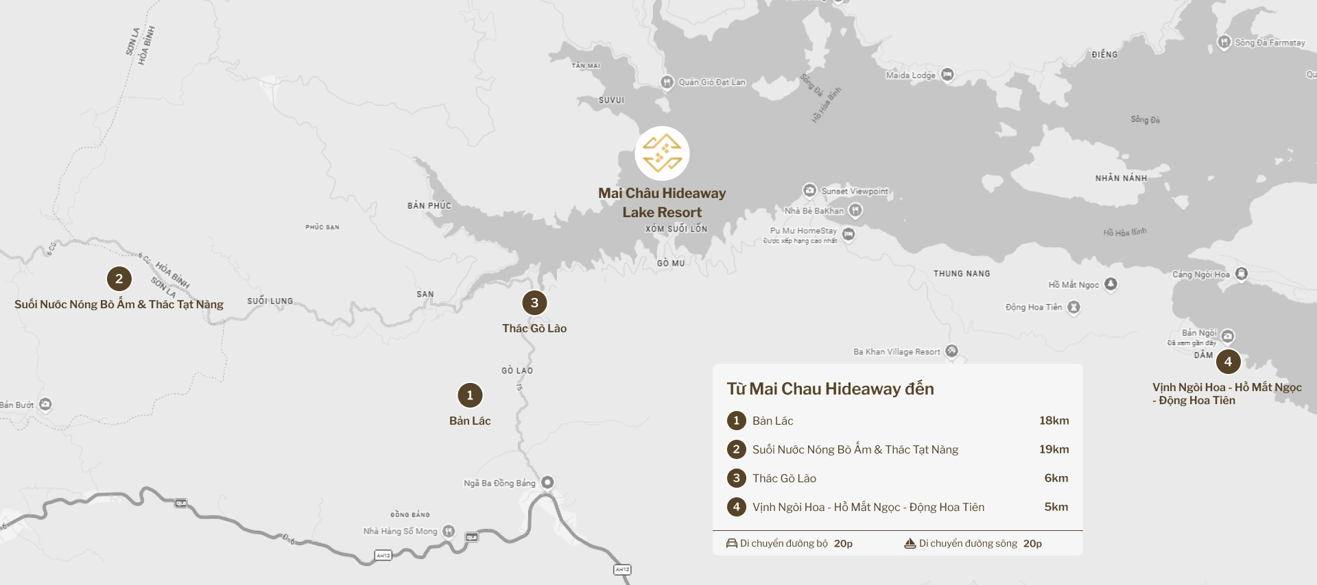 Mai Châu Hideaway Lake Resort là một trong những khu nghỉ dưỡng sinh thái nổi bật tại Tây Bắc, nằm trên bán đảo riêng xinh đẹp bên hồ Hòa Bình, nơi bốn mùa đều mang vẻ đẹp đặc trưng của núi rừng.