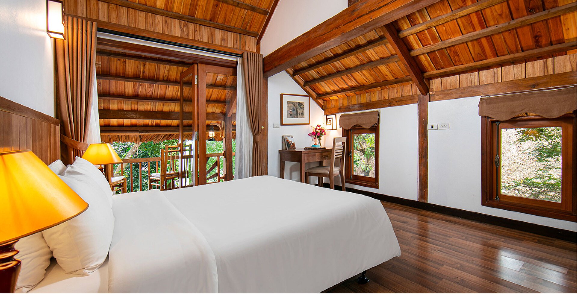 Bungalow: Nằm giữa không gian sân vườn yên tĩnh với những loại cây đặc trưng của vùng núi Tây Bắc. Thiết kế phòng Bungalow được lấy cảm hứng từ sự trong lành, yên tĩnh và tĩnh lặng của thiên nhiên, tạo nên sự đặc biệt quyến rũ nhất của Mai Chau Hideaway Lake Resort.