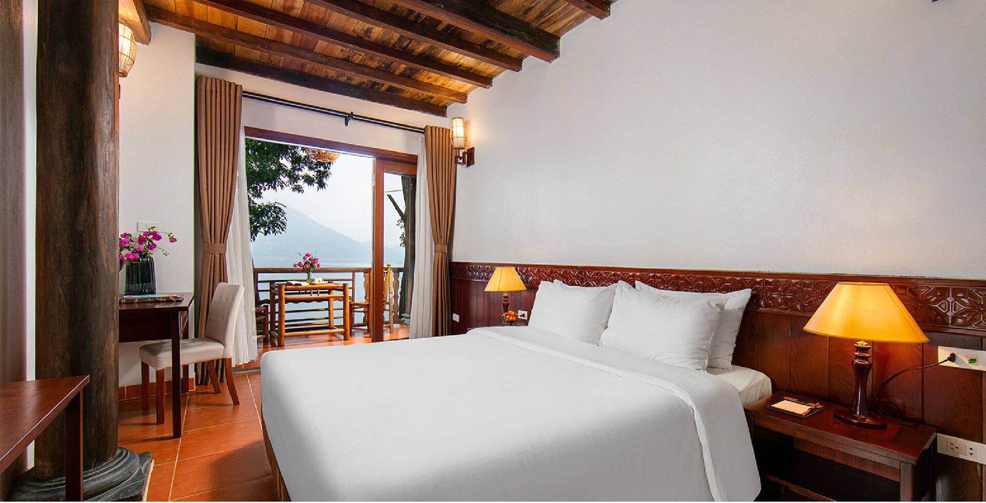 Deluxe King/Twin: Sự kết hợp hoàn hảo cho những ai thích sự đơn giản về công năng của phòng nhưng vẫn đầy đủ tiện nghi. Các phòng Deluxe của Mai Chau Hideaway Lake Resort rộng 36 mét vuông, có phòng khách lớn với bàn làm việc tiện dụng, một phòng tắm rộng rãi tiện nghi. Tất cả các phòng đều có view hồ Hòa Bình xanh mát.