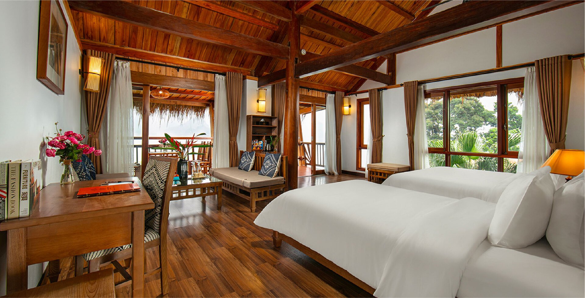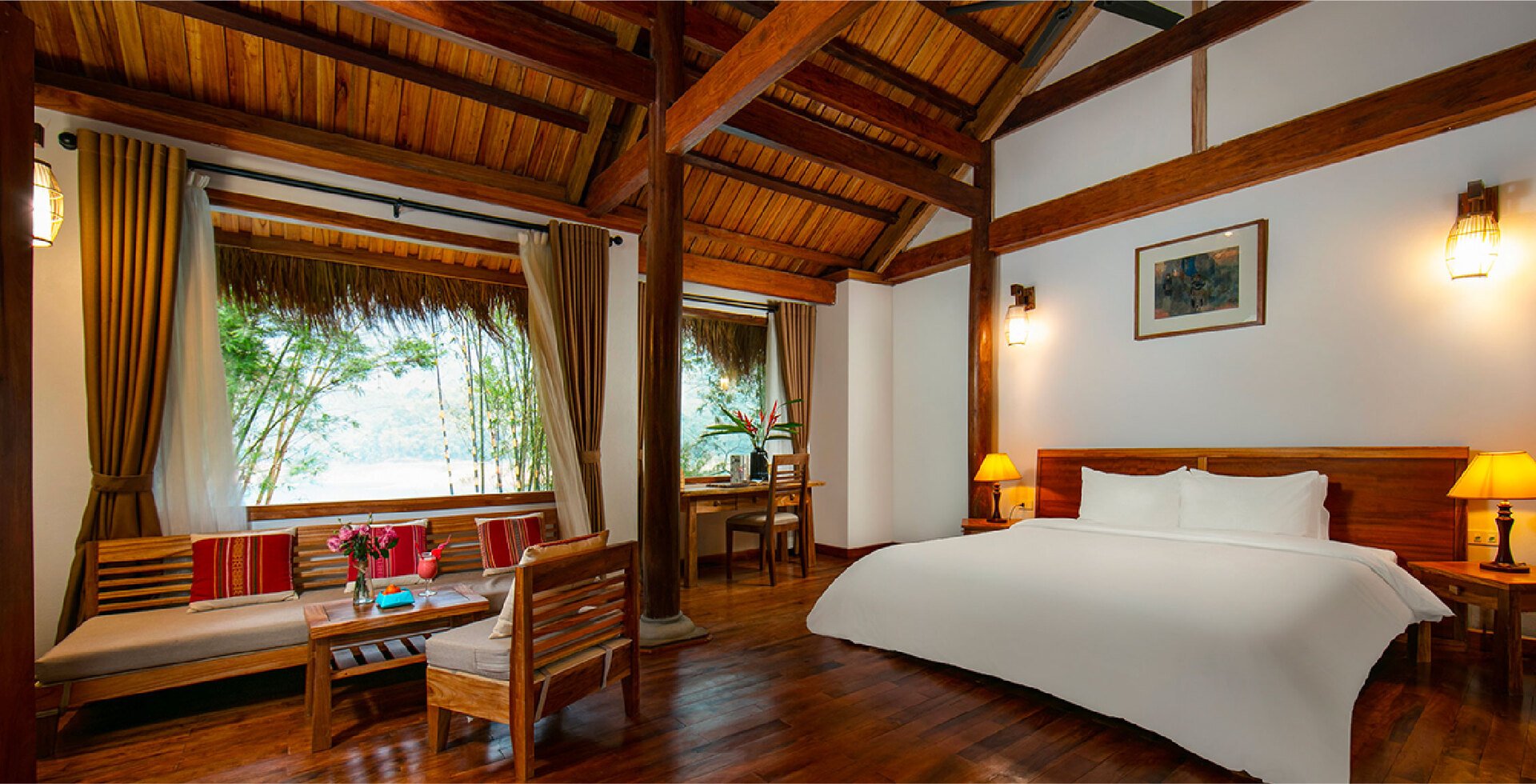 Executive Suite: Mỗi phòng đều được tiêu chuẩn hóa cao và phù hợp với phong cách kiến trúc truyền thống Tây Bắc Việt Nam. Được thiết kế tinh tế và trang nhã mà vẫn mang nét dân tộc miền núi Tây Bắc, Executive Suite sẽ mang đến cho mỗi du khách lưu trú một cảm giác huyền diệu riêng.