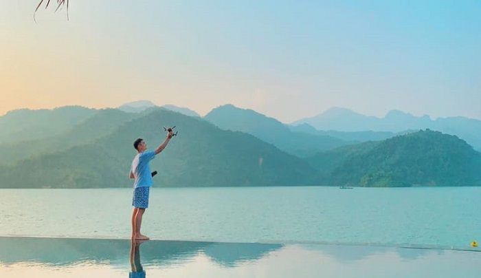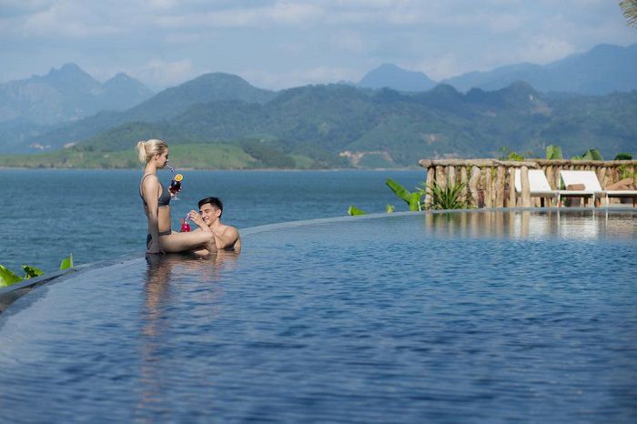 Một hồ bơi vô cực sát mép hồ Hòa Bình được xây dựng và trang trí bằng đá tự nhiên. Đây là địa điểm lí tưởng để các bạn tận hưởng ánh nắng mặt trời cùng với tầm nhìn tuyệt vời ra hồ nước trong khi đắm mình trong làn nước trong xanh hoặc thư giãn trên giường tắm nắng xung quanh hồ bơi cùng với các bàn nhỏ và ô dù. Hãy trải nghiệm những giây phút vui vẻ và làm mới bản thân mình.