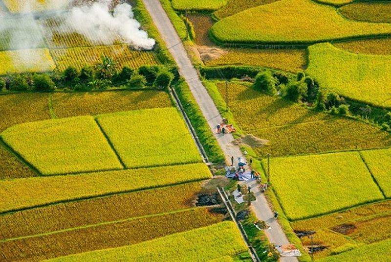 Cuối tháng 10 là thời điểm mà những thửa ruộng lúa chín bước vào mùa gặt, người nông dân tất bật thu hoạch những hạt lúa vàng trên đồng ruộng. Mùi khói tỏa và lúa chín tràn ngập Mai Châu. Lúa chín vàng rực tạo nên một khung cảnh đẹp mắt hút hồn du khách.